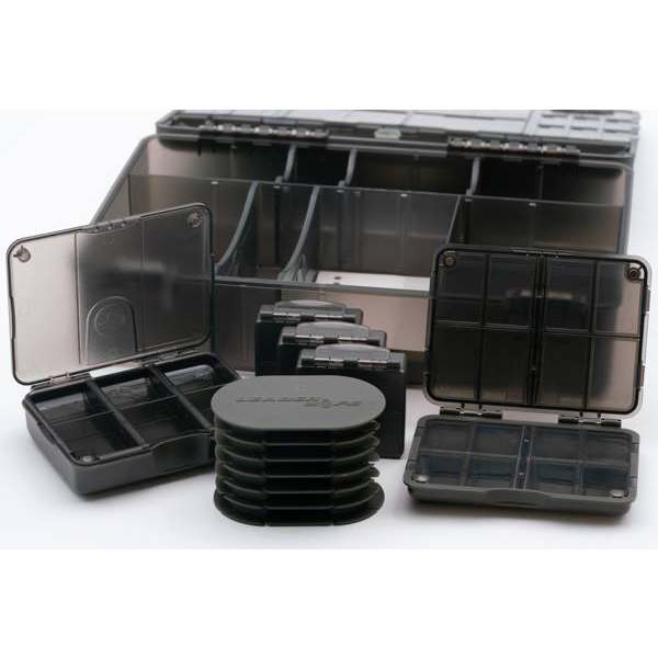 The Tackle Box Bundle is supplied with a Mini Krimp Tool 1x Large Leader-Safe, 1x 9 compartment Mini-Box, 1x 16 Compartment Mini-Box, 3x Accessory Boxes and contains 2 large and 3 small dividers for adjusting the size and layout of the main compartments.