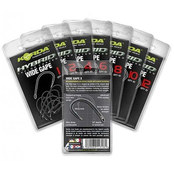 The Korda Hybrid, Wide Gape hook is based on the classic Maruta Kinryu pattern – a popular shape in carp fishing hooks. The point is very slightly in-turned so it catches hold quickly creating solid hook holds every single time. This, coupled with ultra sharpness, forms a formidable hook pattern.