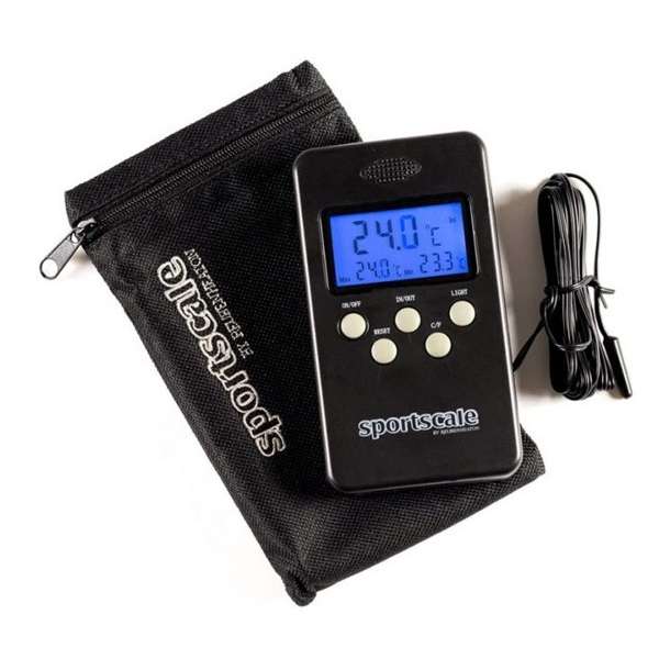 A fully waterproofed external sensor with 3m cable allows constant monitoring over long sessions. Measures in °C or °F in 0.1 degree divisions, and has a range of -10° to 60°C / -2° to 140°F. Comes complete with protective pouch.