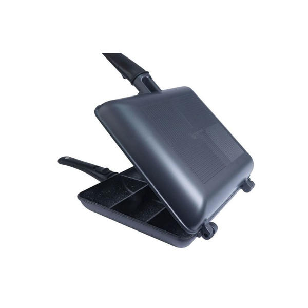 The Ridgemonkey Connect Combi & Steamer Set splits into two distinct frying pans, with one featuring four individual compartments for food separation and the other featuring a deep, flat base ideal for dishes such as stir fry, casserole, and curry.
